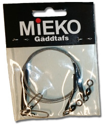 Som tafs kör jag på vanliga wiretafsar på 50 cm eller mer med beteslås och lekande av bra kvalité. Anledningen till längden är för att skona linans nedersta del mot stenar och grejer på botten och även såklart för att vara säker att ingen gädda får in linan i käften. Gillar man fluorocarbon som tafsmaterial så kan man köra på det också men personligen så litar jag inte riktigt på det. Jag tror inte heller på att en gädda bryr sig så mycket om det är en tunn liten tråd framför betet, då borde den nog snarare reagera på att fisken den tänker smaka på ser lite konstig ut och har blänkande krokar på sig.