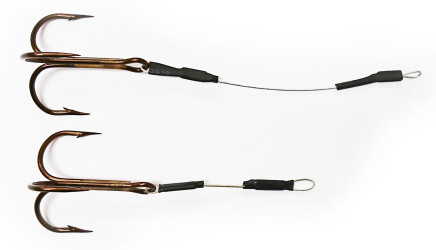 Förut gjorde jag mina stingers av enbart wire som låses med crimps. Jag har dock upplevt problem med detta ibland när en gädda snurrar mycket under drillningen. Då kan den faktiskt lyckas snurra av wiren helt med en tappad gädda som följd. Av denna anledning så har jag nu för tiden alltid ett lekande någonstans på stingern för att förhindra det. Detta gör dock att det inte går att använda wire till den främre kortare stingern eftersom den inte går att göra nog kort med crimpsen. Då använder jag istället fjäderringar så att stinger består av: krok, fjäderring, lekande, fjäderring. Den längre stingern är uppbyggd på följande sätt: krok, wire till rätt längd, lekande. Lekandet på den längre stingern brukar jag sedan sätta i den kortare stingerns yttre fjäderring så att en enda kedja bildas med krokar i vardera ände. Fjäderringen sätts sedan fast i jiggskallen på något sätt, oftast bara genom att helt enkelt fästa den i beteslåset eller hänga den över liggskallens ögla som med en vanlig stinger. Det är lite knepigt att förstå exakt hur det ser ut så jag visar en bild på det hela nedan.