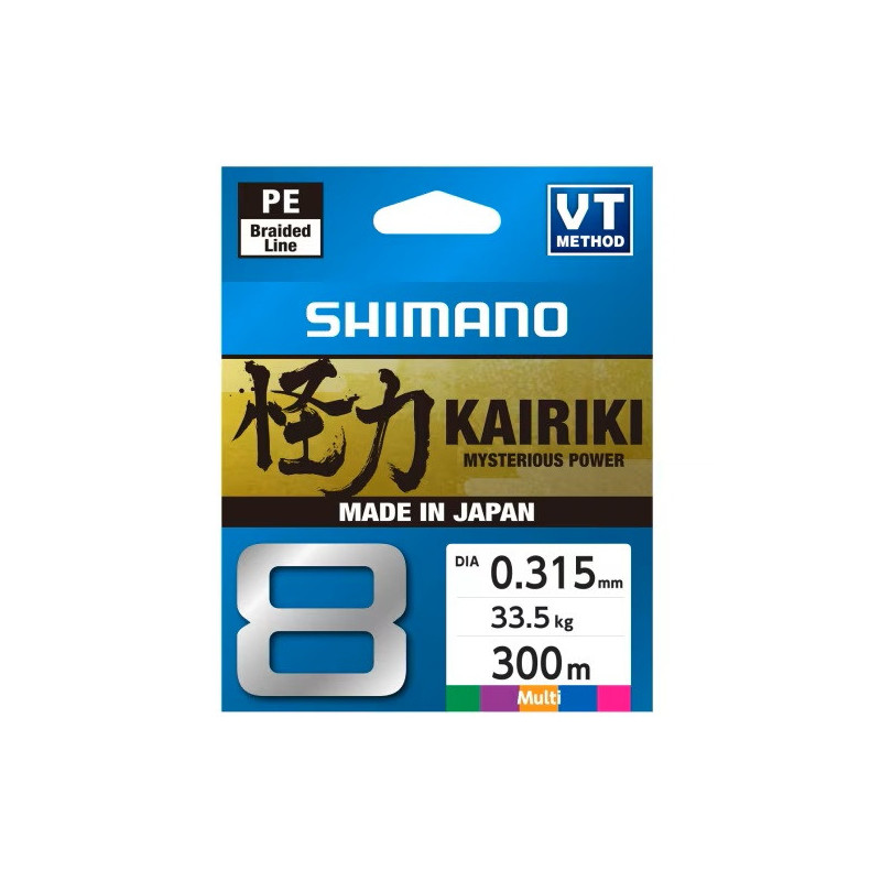 Shimano's Kairiki 8 är japansktillverkad flätlina av hög kvalité, den har lägre än 3% stretch och hög brottstyrka. Linan är flerfärgad och växlar färg var tionde meter med gula/svarta metersmarkeringar över hela linan. Detta för att hålla koll på vilket djup man fiskar på i det fall du inte använder en räkneverksrulle. Linan är flerfärgad (i färgerna Grön, Lila, Gul, Blå & Orange) - så den syns alltid bra, oavsett väder- och vattenförhållanden. Linan lämpar sig bra för både insjöfisket och havsfisket, linan har är mycket stark, och har även riktigt goda kastegenskaper.